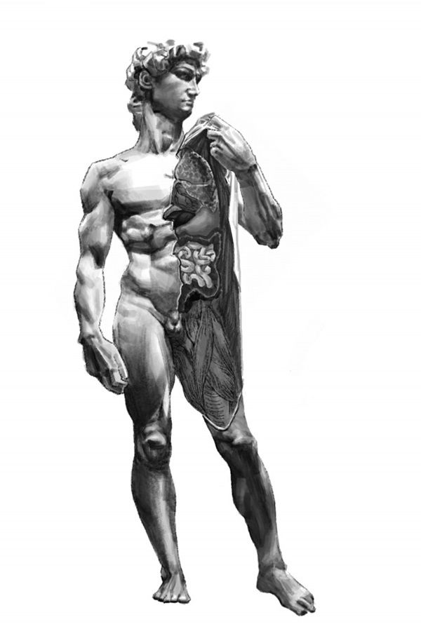 作者以素描形式绘制石膏像,并将其与医学解剖的细节融合在一起。画面中,石膏像每一块肌肉的隆起、每一条肌腱的伸展都被细致描画,以呈现人体结构的力量与动态。在石膏像的手部,作者特别设计了拨开皮肤这一动作,缄默的石像剥露出鲜活的人体结构。这样一来,它不再仅仅是一尊静默的雕塑,还是一个有血有肉、鲜活的存在,在无声中诉说着生命的伟大与脆弱。这部作品是对艺术的致敬,也是对医学的颂扬。就像画中雕像“大卫”的创作者米开朗基罗所说的:“我不是要创造一件艺术品,而是要创造一个生命体。”