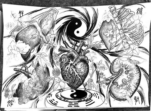 中医经典中有这样两句话:“心为五脏六腑之大主”“心为君主之官”。可见心脏的重要地位,因此心脏被绘制在作品中央。“肝升于左,肺藏于右”,肝脏位于画作的左侧,肺脏被绘制在画作右侧。黑白两色太极图在不同方位对应人体五脏,在《周易》中亦对应着不同的卦象。作者绘制五脏的解剖图,并在不同方位将其与太极图相对应,契合“天人合一”的观念。