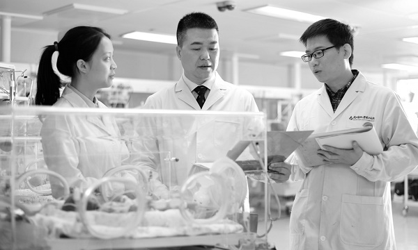 王斌(中)和团队正在查看新生儿状况。