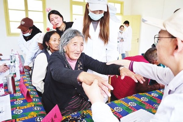 在西藏自治区昌都市同卡镇卫生院内,来自北京的医疗专家为当地村民义诊。