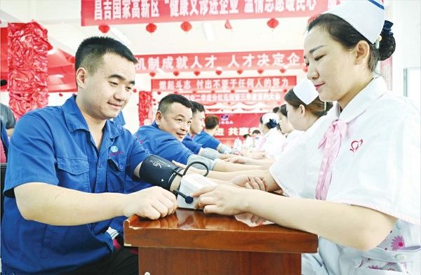 在新疆维吾尔自治区昌吉国家高新技术产业开发区的一家企业,来自福建泉州的医护人员正在为企业员工量血压。