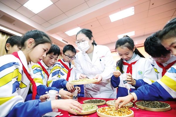 12月20日,天津市和平区鞍山道小学联合市卫生健康促进中心等开展“悠悠本草香——中医药文化进校园”活动。图为学生们在专业人员的带领下近距离体验中药。 沈岳 摄