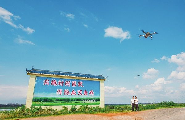 封洲禁牧是切断血吸虫病传染源的重要措施。图为6月6日,江西省南昌市南昌县血防站工作人员利用无人机巡查鄱阳湖草洲深处耕牛放养情况。衷凯 摄