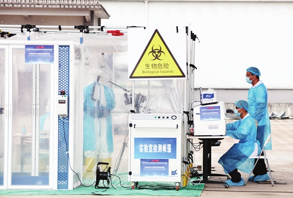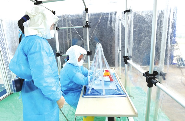 卫生应急人员使用移动负压帐篷实验室处理疑似高致病性样本 黄兴能 摄