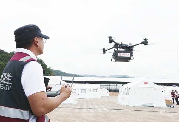 卫生应急人员用无人机运送药品等物资 黄兴能 摄