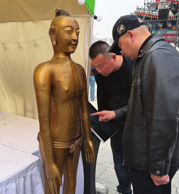 3月27日,沧州活动现场,市民与智能针灸铜人“互动”。