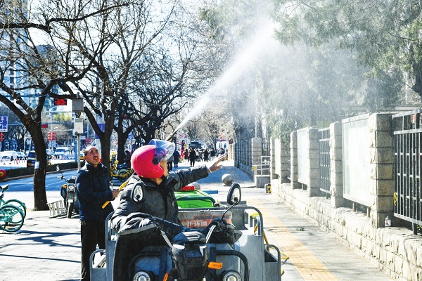 3月18日,北京市朝阳区三里屯街道,工作人员用高压水枪冲洗圆柏树冠,以抑制花粉扩散。