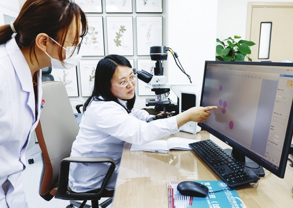 3月25日,北京世纪坛医院变态反应中心花粉研究室花粉监测员宁慧宇带教一名来自青海省的学员如何阅片。
