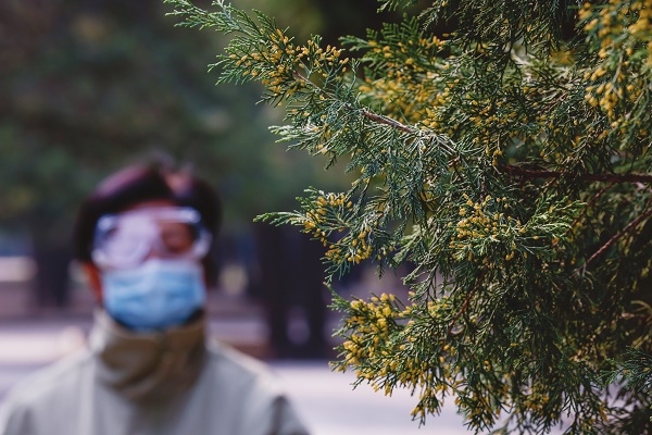 3月22日,北京市街头,圆柏迎来花期,花粉过敏者全副武装。
