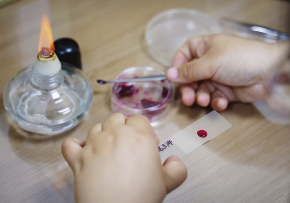 3月25日,北京世纪坛医院变态反应中心花粉研究室花粉监测员宁慧宇对收集到的花粉进行染色处理。