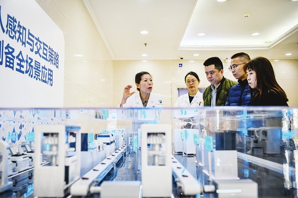 3月20日,北京市红十字血液中心工作人员为参观者介绍基于人工智能的机器人感知与交互策略血液集中化制备设备。