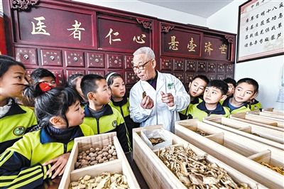 3月17日,小学生在药剂师的指导下识别中药材。3月17日是中国国医节,山东省青州市云门山街道孟家小学开展学习中医药知识实践活动,组织部分学生到一家中药店参观,识别、称量中药材,感受中医魅力,弘扬传统中医药文化。王继林摄