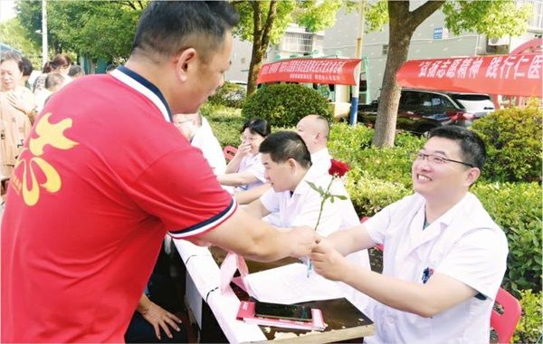 8月17日,江苏省海安市人民医院医师团队走进该市星海社区开展“义诊进社区 服务零距离”活动,用实际行动“预热”中国医师节。图为活动现场,一位当地居民向医师送上鲜花和节日祝福。通讯员 张红娟 陈建静 特约记者 程守勤 摄影报道