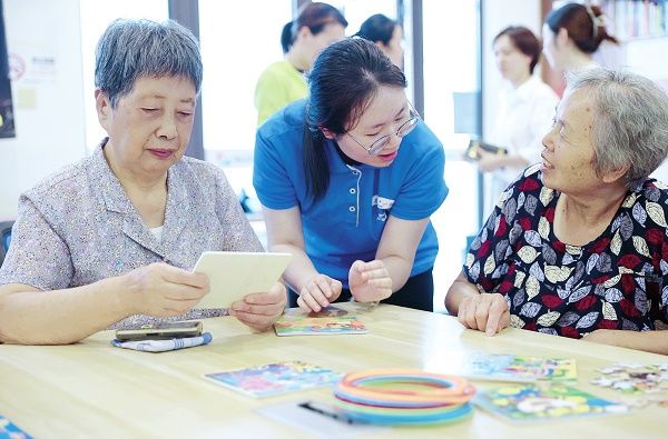 8月26日,浙江省杭州市上城区南星街道的老人日托班迎来一名“00后”志愿者。据悉,一批年轻志愿者通过参与代际互助“养老﹢志愿服务”项目,解决了在杭州求职期间的住宿难题,也为社区的老人送上温暖的服务。图为一名志愿者指导老人做手工。视觉中国供图