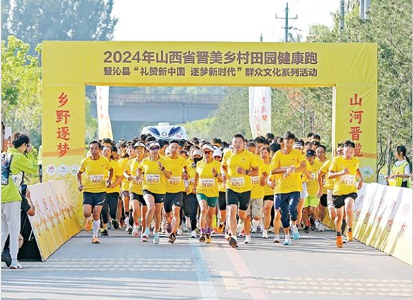 9月7日,2024年山西省晋美乡村田园健康跑系列比赛(第二站)暨沁县“礼赞新中国 逐梦新时代”群众文化系列活动在长治市沁县北海湖畔鸣枪开跑。来自全国各地的600余名跑步爱好者参加了乡村田园健康跑活动。CFP供图