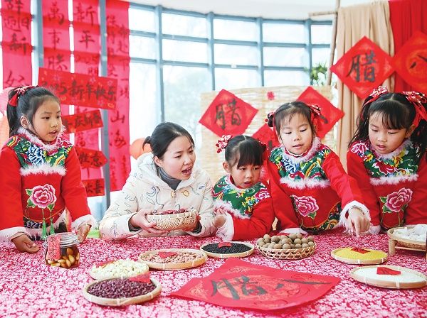 1月7日,农历十二月初八,为我国传统节日“腊八节”,民间有喝腊八粥的习俗。1月6日,江苏省南通市如皋市下原镇下原幼儿园举行“辨食材 迎腊八”主题活动,小朋友们在老师的指导下,学习辨识制作腊八粥的食材,感受传统民俗文化。图为孩子们在老师的指导下了解腊八习俗。视觉中国 供图