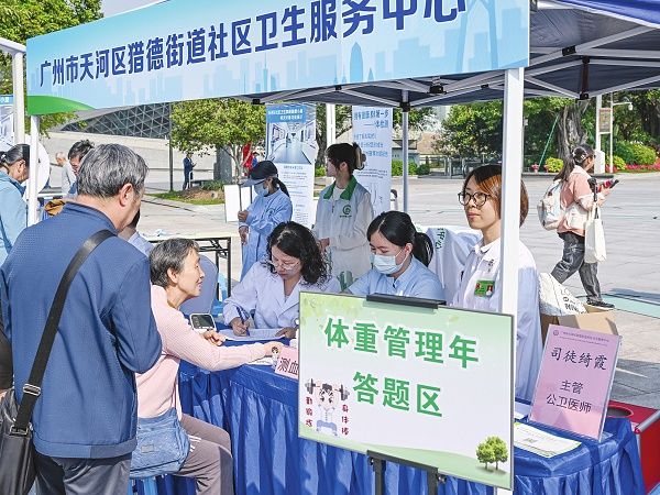 近日,以“科学控体重 活力迎全运”为主题的2025年广东省“体重管理年”现场活动在广州市花城广场举行。图为广州市天河区猎德街道社区卫生服务中心医务人员通过知识问答的方式,向居民进行体重管理知识宣教。视觉中国 供图
