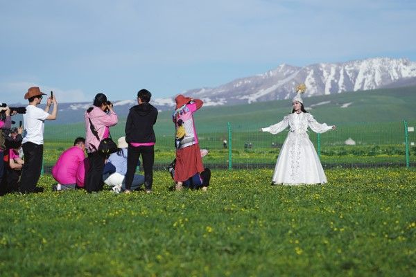 进入5月,位于新疆维吾尔自治区伊犁哈萨克自治州的那拉提草原进入盛花期,鲜花、草原牧场与远方天山山脉上的白雪构成一幅自然美景,吸引众多游客观光旅游。图为5月13日,游客在草原拍摄写真。