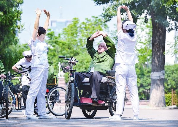 近年来,山东省第二荣军优抚医院指导残疾退役军人练习八段锦,通过健康养生提升他们的康复效果和生活质量。图为近日,该院医务人员向残疾退役军人展示八段锦的“两手托天理三焦”动作。通讯员 杜厚平 王红民 特约记者 王宇 摄影报道