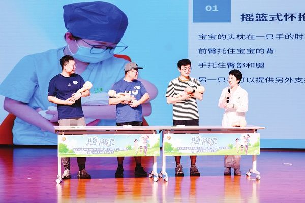 9月13日,由上海市总工会女工委、市医务工会指导,浦东新区总工会联合区卫生健康委主办,上海市第一妇婴保健院承办的“奶爸学院”落地仪式举行。图为活动中,奶爸们展示抱宝宝、拍奶嗝等育儿技能,段怡副主任护师在一旁给予专业点评和指导。特约记者 高艳 摄