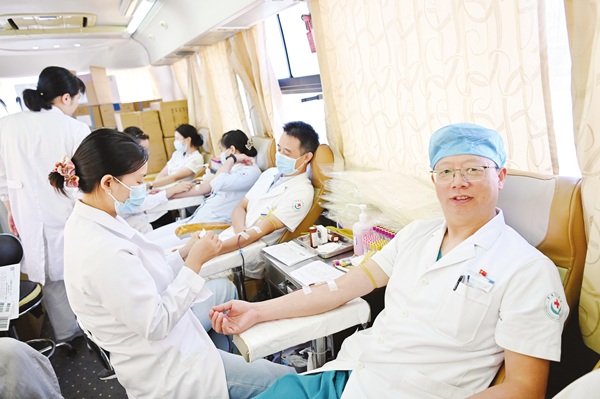10月9日,浙江省东阳市,东阳市中医院的医护人员在采血车上献血。当日,该院开展无偿献血活动,广大职工踊跃参与。献血队伍中,既有临床一线的医务人员,也有行政后勤的工作人员;有的刚刚结束夜班匆匆赶来,有的趁工作间隙抽空而来;还有多次献血的“老面孔”带着年轻同事共同伸出手臂,献出热血。视觉中国供图