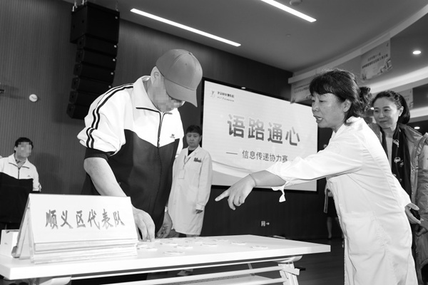 集体项目“语路通心”是整个赛场最“燃”的环节。在每队5名参赛者面前的桌上随机放置了16张卡牌(8对相同图案),背面朝上。每队首位参赛者佩戴红帽子,听到裁判指令后迅速跑至桌前,翻开一张卡牌后返回队伍,将帽子佩戴至第二位队员头上,同时仅通过口头语言告知所翻卡牌的图案及位置信息。第二位队员得到信息后戴着帽子跑至桌前,翻开另一张卡牌。若翻开的两张卡牌图案相同,则将其收走;图案不同,则将两张卡牌翻回背面朝上状态。其后队员以此类推,最后一位选手收走最后两张配对卡牌后完赛。