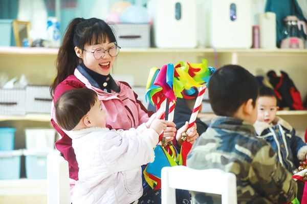 1月13日,在贵州省黔西市莲城街道托育中心,老师带着孩子们做游戏。近年来,黔西市莲城街道聚焦婴幼儿照护民生实事,积极推动社会力量兴办托育机构,通过落实落细卫生保健、资金补贴、志愿服务等多层面扶持政策,加快建设普惠托育服务体系,全力打造“15分钟托育圈”。视觉中国供图