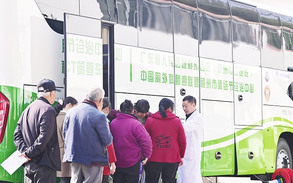 1月30日,在江西省赣州市章贡区水西镇凌源村,村民排队准备进入移动CT筛查车接受免费身体检查。这辆移动CT筛查车配备独立扫描舱、远程操作间以及5G通信设备,具备CT扫描、远程医疗等服务功能。视觉中国供图