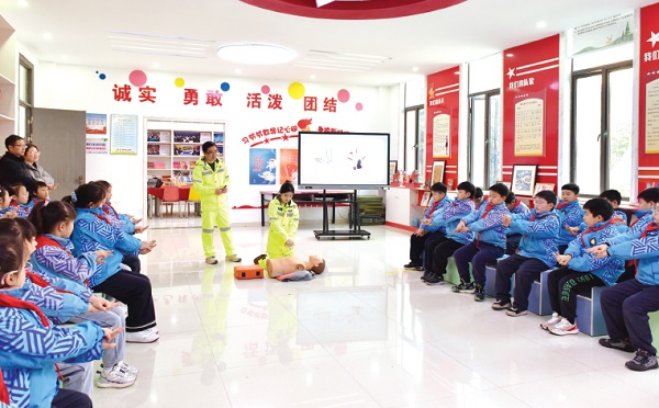 连日来,浙江省湖州市长兴县急救中心“生命守护志愿服务队”深入学校,开展集急救知识科普与普法教育于一体的“生命教育”主题活动。图为近日,在长兴县第二实验小学忻湖路校区,志愿服务队队员与学生互动,普及急救知识。通讯员 朱爱平 宿瑶瑶 特约记者 郑纯胜 摄影报道