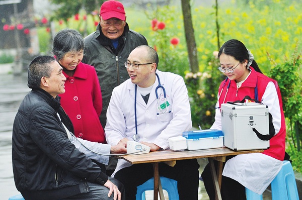 3月13日,四川省绵阳市安州区人民医院医师尹华强在安州区河清镇广红村为村民体检。近年来,安州区深化县域医共体建设,通过“区聘乡用”等机制让区级专家下沉乡镇开展义诊等服务。通讯员 成和平 王清清 特约记者 喻文苏 摄影报道