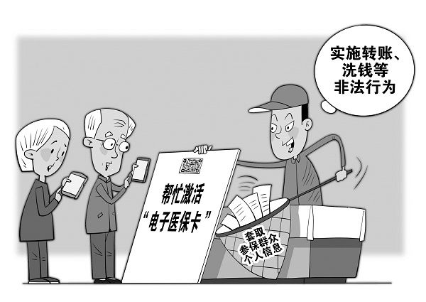 新华社近日发布消息称,河南省邓州市公安局查获的一起案件中,犯罪团伙以帮忙激活“电子医保卡”为名,套取参保群众个人信息,实施转账、洗钱等非法行为。对此,国家医保局强调,国家医保局及下属部门、单位,从未授权任何社会人员开展涉及“电子医保卡”激活等相关工作,广大人民群众一定要擦亮双眼、提高警惕,谨防上当受骗。朱慧卿 绘