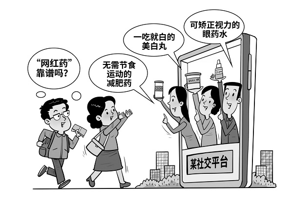 近日,有媒体曝光了“网红药”虚假宣传的乱象,例如,宣称“不用节食运动就能瘦”的减肥药、标榜“一吃就白”的美白丸等。这些产品打着“神奇功效”的幌子,通过网络平台营销,实则效果有限,甚至暗藏健康风险。