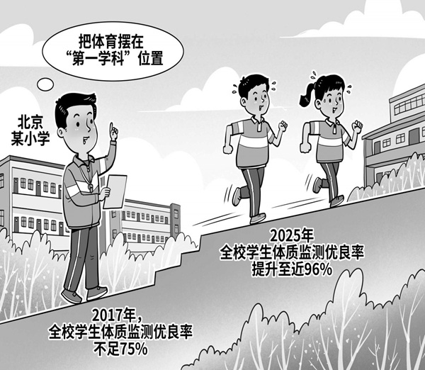 媒体报道,北京一小学多年来坚持把体育作为“第一学科”,将晨练、体育课、大课间、课后体育活动连成完整体系。该校学生通过“每天必动、人人参与”,体质监测优良率从2017年的不足75%提高到2025年的近96%。 这组数据背后是学生们的体重降了、肺活量涨了,身心更健康了。期待更多学校以体育课程为支点,护航学生全面成长,让“健康第一”教育理念照亮每个孩子的未来。(王尚)