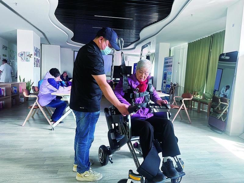 图为84岁的王奶奶在工作人员帮助下体验智能助行机器人。实习记者 李芸仪 本报记者 杨利春摄影报道