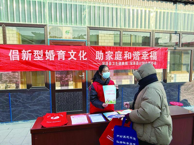 近日,河北省深泽县卫生健康局、县计生协在留村乡西北留村联合开展以“倡新型婚育文化 助家庭和谐幸福”为主题的宣传服务活动。图为工作人员为群众发放相关宣传资料。刘舒畅摄