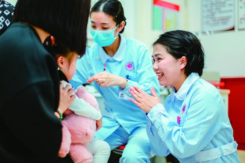 在重庆市妇幼保健院,医护人员正在跟前来接种疫苗的小朋友交流。重庆市妇幼保健院供图