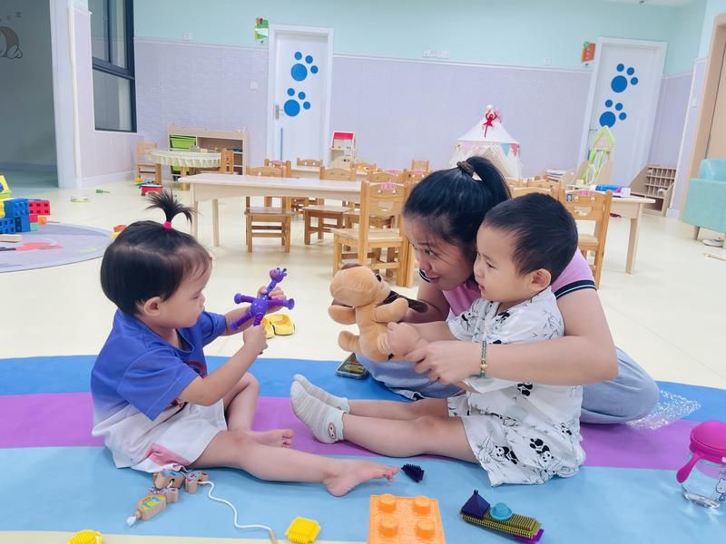 海口市秀英区托育中心的老师和孩子们在玩游戏。海南省卫生健康委人口家庭处供图
