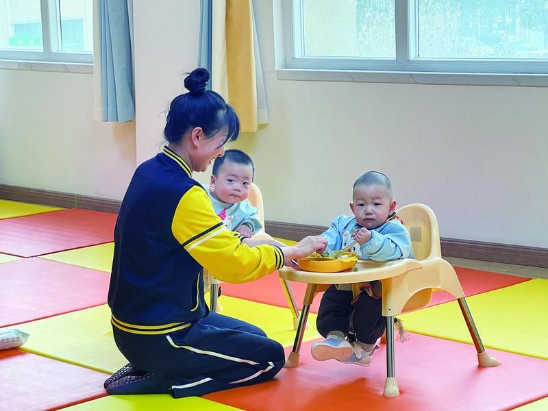 3月26日,河南省三门峡市初之光国际婴幼儿托育中心内,育婴师在为乳儿班的孩子喂辅食。本报记者 严少卫摄