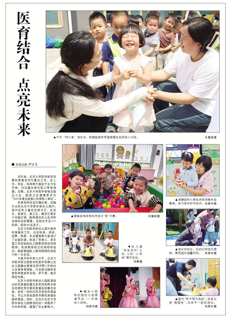 近年来,北京大学医学部将发展托育服务列为重点工作,在人员、资金、场地等方面给予全方位支持,切实解决单位职工带娃难题。近期,北京大学医学部被全国总工会、国家卫生健康委评为“2024年度全国爱心托育用人单位”。