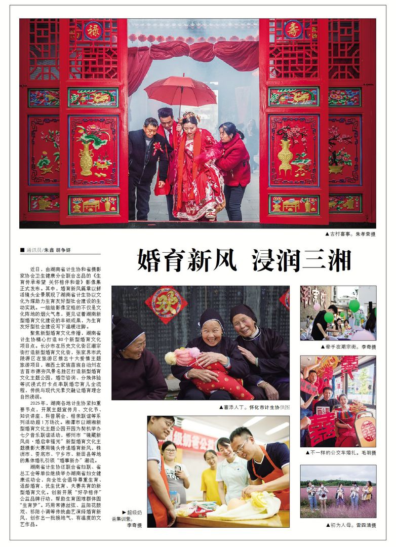 近日,由湖南省计生协和省摄影家协会卫生健康分会联合出品的《生育传承希望 关怀相伴和谐》影像集正式发布。其中,婚育新风篇章以鲜活镜头全景展现了湖南省计生协以文化为媒助力生育友好型社会建设的生动实践。一组组影像定格的不仅是文化阵地的烟火气息,更见证着湖南新型婚育文化建设的丰硕成果,为生育友好型社会建设写下温暖注脚。