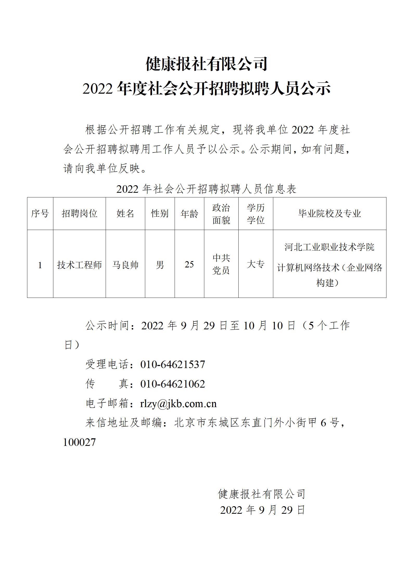 健康报社有限公司2022年度社会公开招聘拟聘人员公示