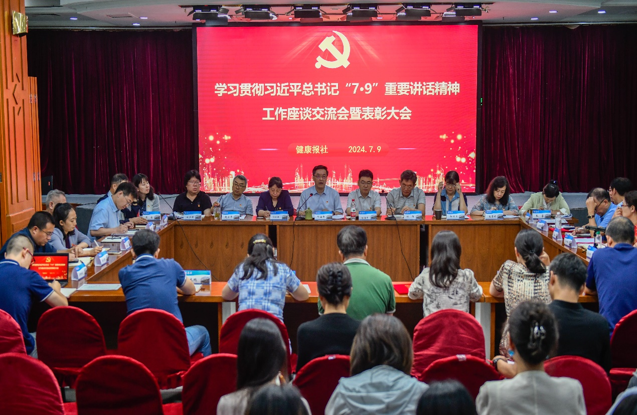 7月9日,健康报社召开学习贯彻习近平总书记“7•9”重要讲话精神工作座谈交流会暨表彰大会。会议传达国家卫生健康委学习贯彻习近平总书记“7•9”重要讲话精神工作座谈会精神,就学习贯彻习近平总书记“7•9”重要讲话精神的工作经验作交流发言,对2023-2024年度先进基层党组织和优秀个人进行表彰,开展了新党员入党宣誓和老党员重温入党誓词活动。党委书记、董事长邓海华作总结讲话。