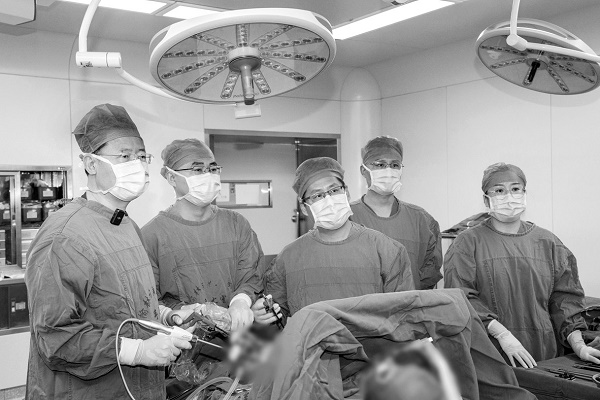 图为佘军军教授(左一)带领团队为90岁患者行腹腔镜胃癌根治术。