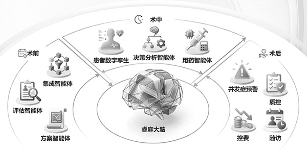 “睿麻助手”作为国内首个投入临床使用的麻醉多智能体协作平台,代表着AI在麻醉核心业务领域的深度应用。该系统由21个专业智能体组成,包括集成、评估、监测、预警、决策、药物、质控、随访等智能体,形成了协同工作的智能生态系统。这种多智能体协作架构使系统能够模拟专家会诊流程,实现更精准、更可靠的风险识别与决策支持。初步应用显示,系统在提升医疗安全性和效率方面成效显著,可将术前评估时间从30分钟缩减至5分钟,大幅减少文书与重复访视工作。在术中,系统可通过虚拟人界面实现“风险预警—归因—决策”闭环,实时监测生命体征,异常即时弹窗提醒,自动关联术中用药与操作,辅助医生快速归因。