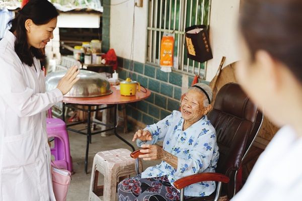 2月20日,在白沙县牙叉镇营盘村,韦小丽(左一)与村医到89岁的符大娘家中为其提供健康服务。