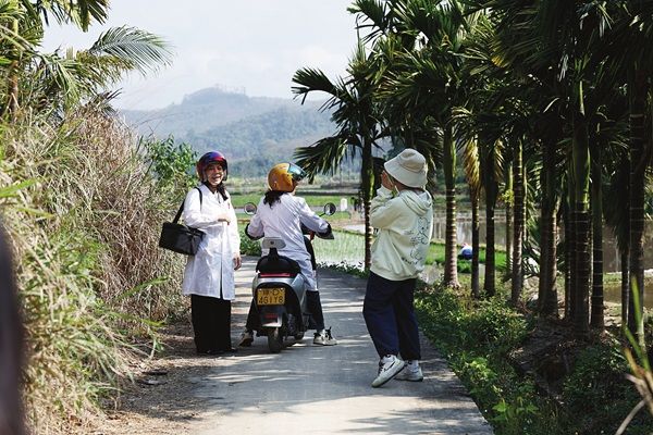 2月20日,在白沙县牙叉镇营盘村卫生室附近,韦小丽(左一)与村医符林娜(左二)在入户随访路上,与偶遇的村民交谈。