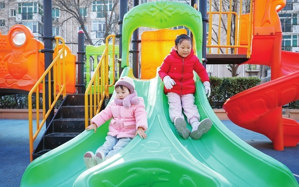 2月3日,北京市通州区紫荆雅园小区的小广场上,孩子们在滑梯上玩耍。昔日的荒草地已化身为居民休闲聚集地。