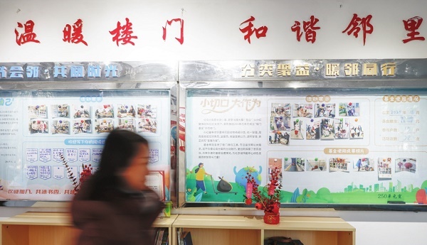 2月3日,北京市通州区紫荆雅园小区的楼道里,“温暖楼门 和谐邻里”的宣传板展示着居民自治成果。