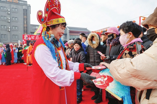 2月5日,天津市宁河区芦台大集上,身着传统戏服的演员向赶大集的群众发放“健康红包”。