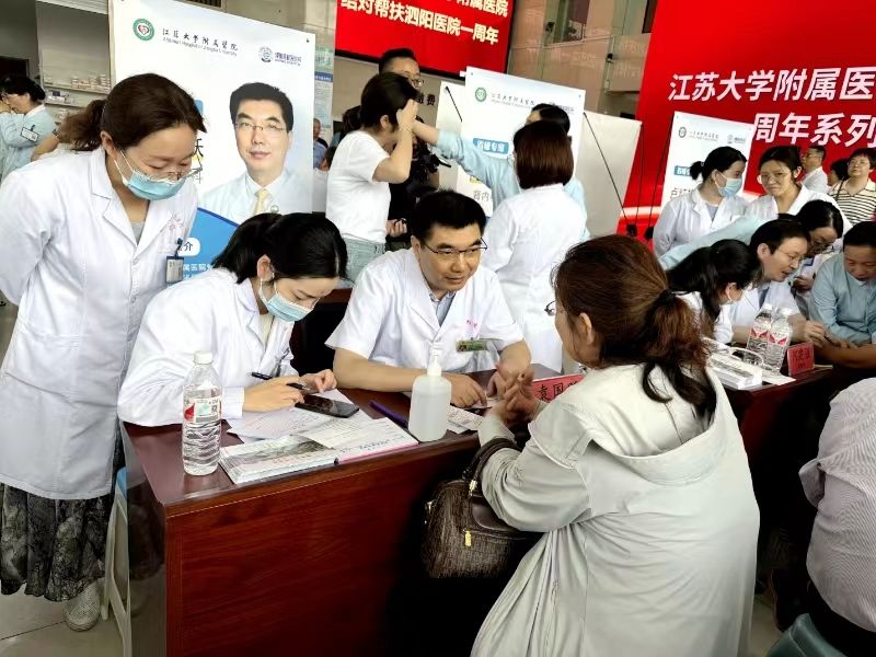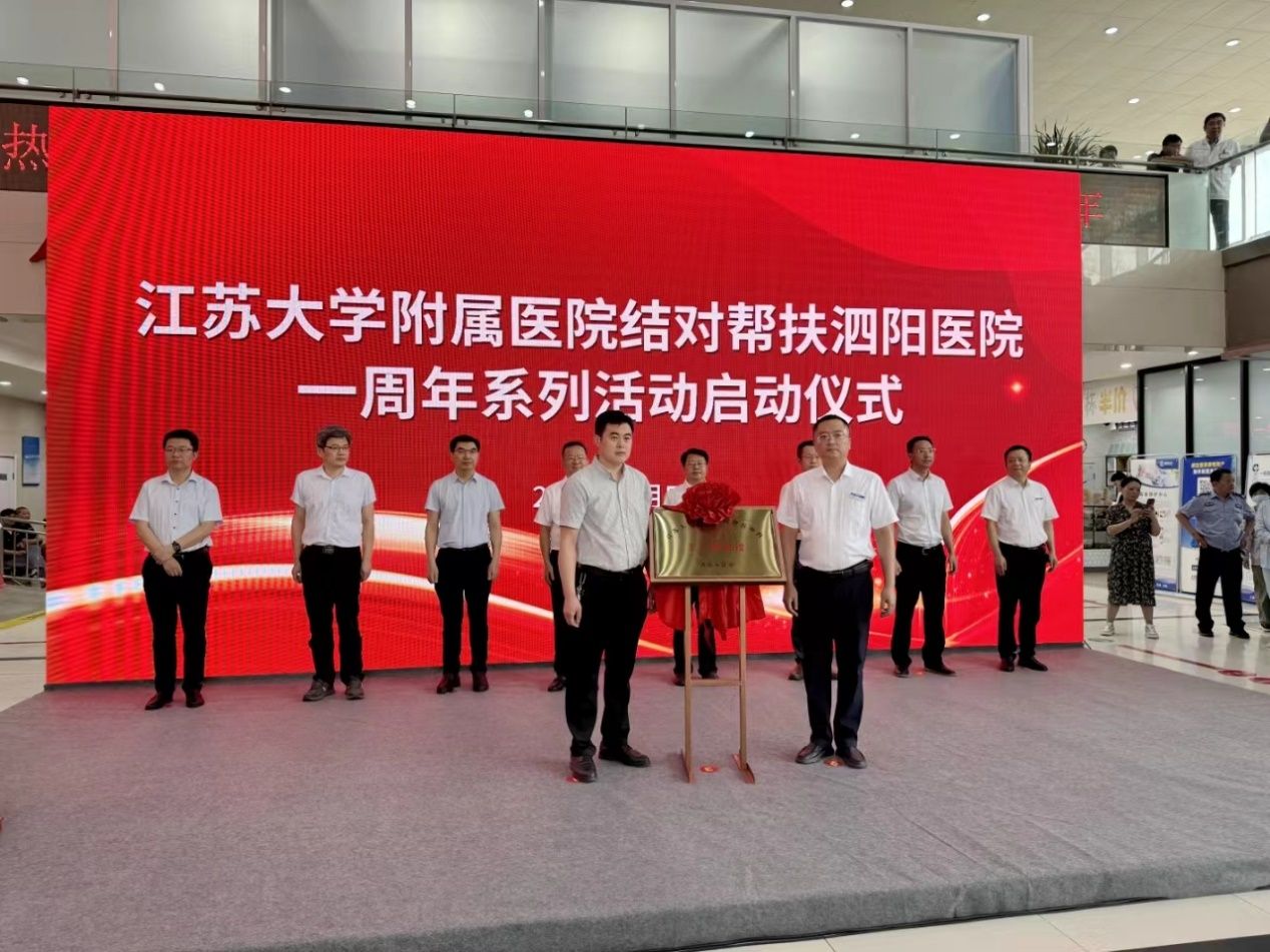 7月5日,江苏大学附属医院(简称江大附院)结对帮扶江苏省宿迁市泗阳医院一周年系列活动启动仪式在泗阳医院举行。